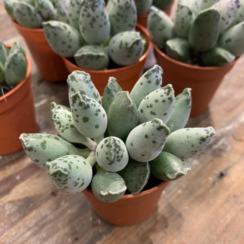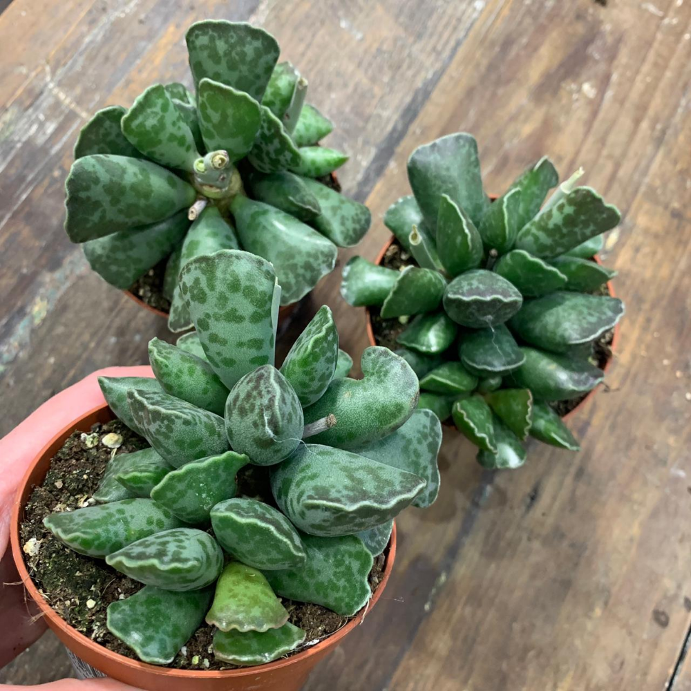 Адромискус макулатус или пятнистый – необычайно красивый цветок. У него округлые пятнистые листья, которые окрашены в зеленый цвет. Также на их поверхности есть небольшие пятнышки с сероватым оттенком. Данный сорт неприхотлив в уходе и идеально подходит для выращивания в квартире.