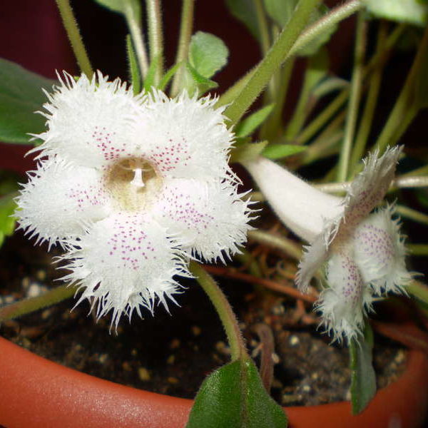 Сигнет – тот самый гибрид, о котором говорилось ранее. Он совмещает черты обоих родителей (гвоздикоцветной и точечной альсобий). Листья крупные, овальные, с зазубренными краями. Лепестки белые с крупной бахромой, зев – желтоватый, покрыт мелкими красными или розоватыми пятнышками.