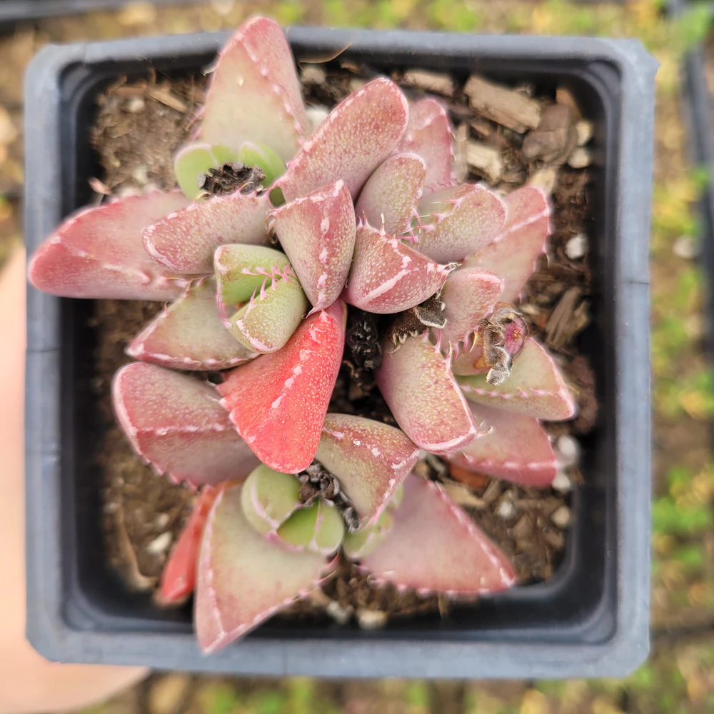 Этот уникальный суккулент, широко известный как тигровая пасть, имеет треугольные листья с острыми зубчатыми краями, которые придают ему характерный вид. Листья обычно зеленого или серовато-зеленого цвета с небольшими белыми точками на них. Растение обычно вырастает до шести дюймов в высоту и может достигать 12 дюймов в ширину.