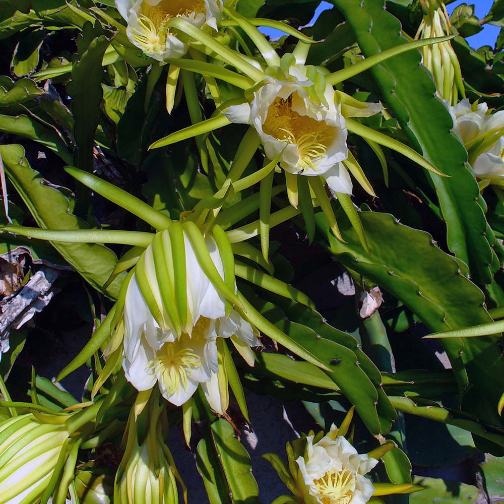 Цветки очень большие, белые, реже розовые. Плод – это питайя. Ее вкус чаще всего сравнивают с киви. Размер плода может в значительной степени варьироваться в зависимости от вида и условий содержания. Кожура чаще всего пурпурная, у крупноцветковой и окампской разновидностей – желтая.
