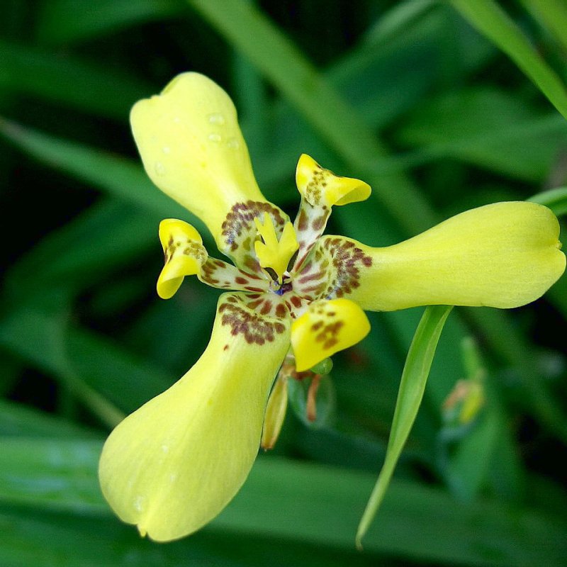 Этот вид шагающего ириса отличается более массивными и широкими листьями размером до метра, а также окрасом цветов. Они, как правило, лавандового или фиолетово синего цвета, с белыми акцентами на поверхности. Цветы тоже душистые, их размер может достигать десяти сантиметров. У такого растения немного более длительный период цветения.
