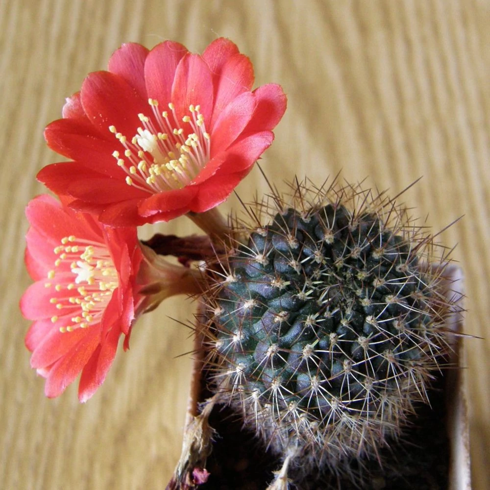 Максимальная высота растения – всего лишь 2 см. Стебель не шаровидный, а слегка вытянутый. Покрыт множеством мелких белых колючек. Этот миниатюрный вид имеет большие цветки красного или рыжего оттенков.